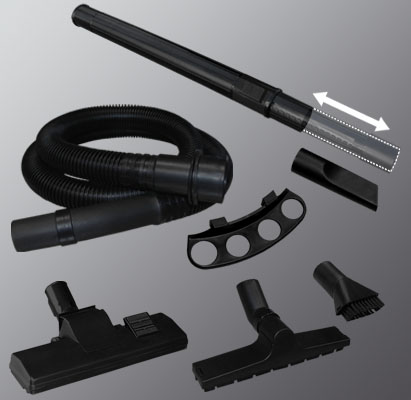• Accesorios incluidos: manguera flexible con codo, tubo telescópico regulable, boquilla doble uso, boquilla para líquidos, boquilla para alfombras, cepillo redondo, 2 filtros de espuma