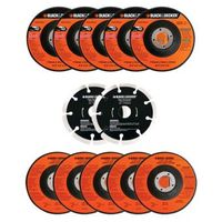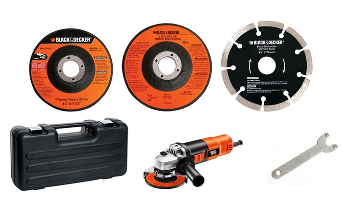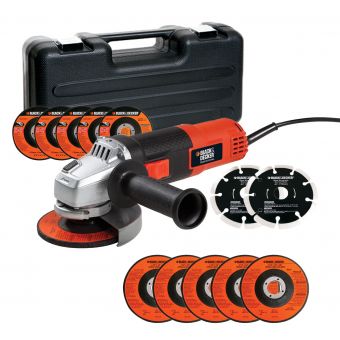 Incluye: amoladora, maletín, llave, 5 discos de desbaste, 5 discos de corte para metal, 2 discos diamantados segmentados