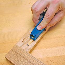 • Con la Kreg Jig ® Mini está garantizada la correcta realización de perforaciones para tornillos ocultos, ya que su guía de taladro forjada en acero endurecido evita que la broca se desvíe mientras perfora la pieza de trabajo